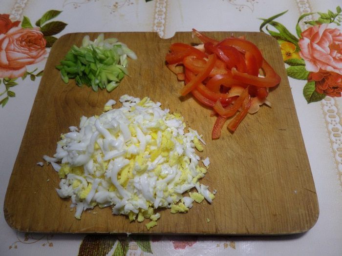Нарезаем соломкой болгарский перец. Нарезаем зелень. Яйцо натираем на терке.