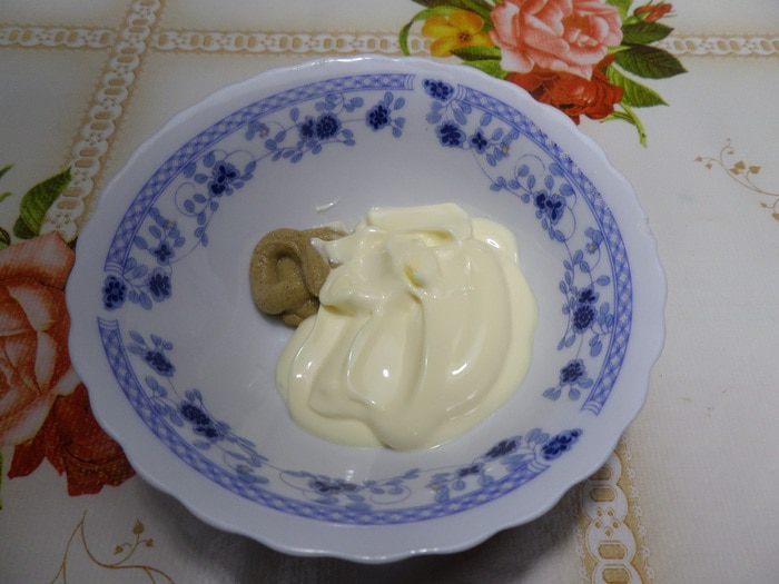 Готовим соус-заправку. Смешиваем майонез и горчицу.