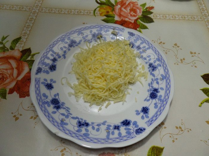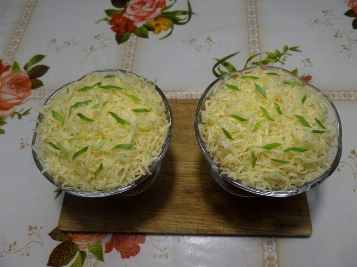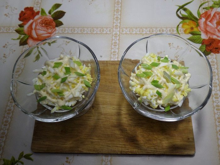 Собираем салат. Выкладываем натертое яйцо, смазываем соусом-заправкой. Посыпаем зеленым луком.