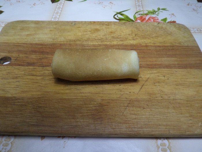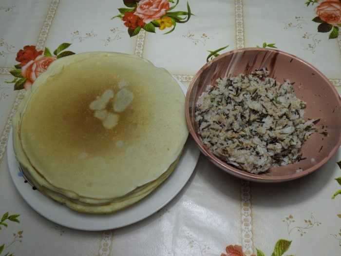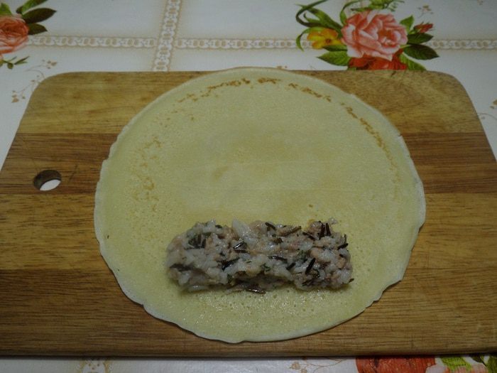 Приступаем к фаршированию блинов. На блин выкладываем 1 — 2 ч. л. начинки и сворачиваем.