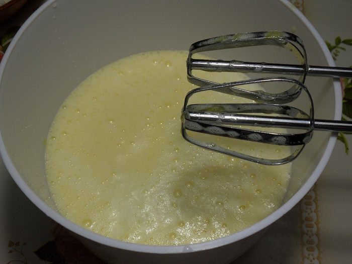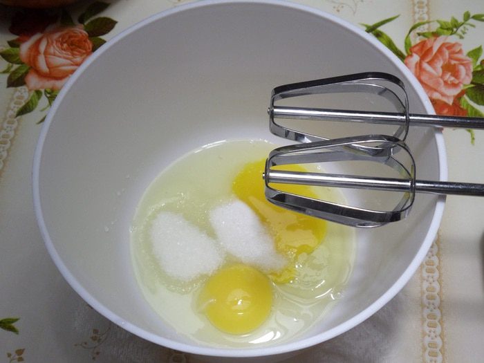 В чашу разбиваем куриные яйца. Добавляем соль и сахар. Взбиваем миксером.