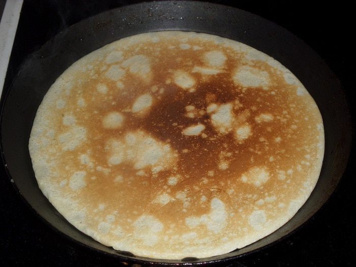 Фаршированный блин готов. Таким образом фаршируем испеченные блины. Фаршированные блины выкладываем на противень и отправляем в разогретую духовку на 5 — 10 минут.