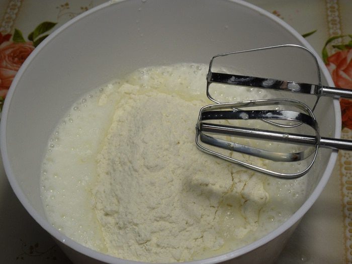 Добавляем просеянную муку и разрыхлитель. Хорошо взбиваем миксером.