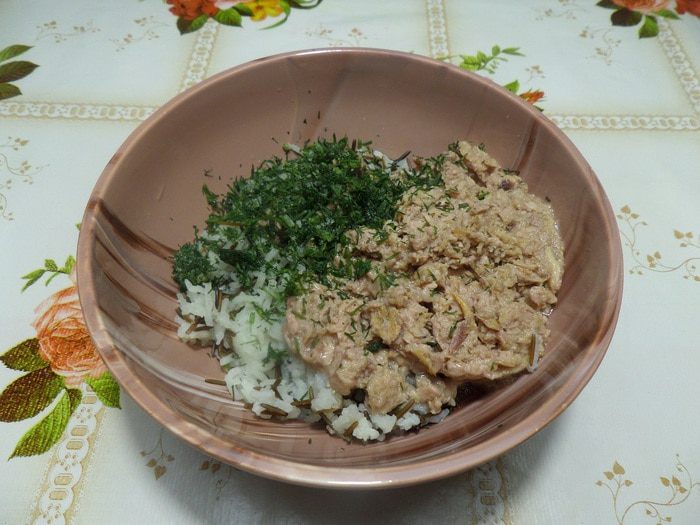 Готовим начинку. В чашку выкладываем отварной рис, консервированного тунца ТМ «Магуро» и зелень (укроп). Хорошо перемешиваем. По вкусу можно добавить смесь перцев.