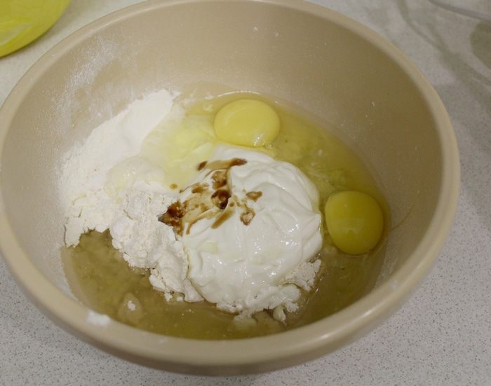 Добавить сметану, ваниль, яйца и масло. Взбить до однородности.