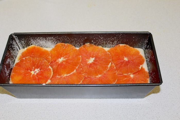 Апельсины очистить от кожицы, порезать кружочками и выложить поверх теста.