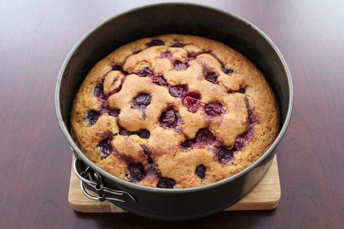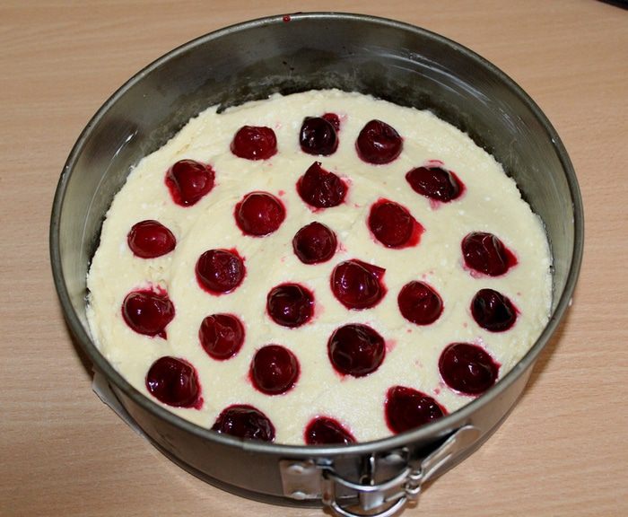 Выложить тесто в смазанную форму диаметром 20 — 22 см, сверху выложить ягоды.