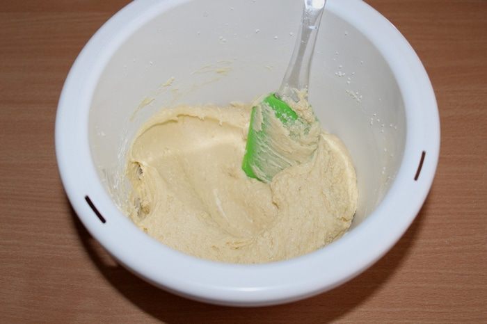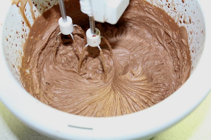 Масло взбить с сахаром и ванилью до пышности, затем вбить по одному яйца, добавить уксус, снова взбить.