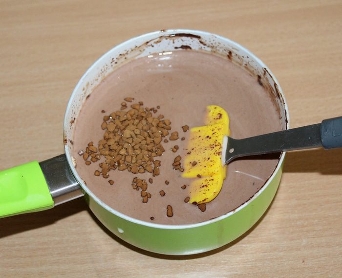 Для крема: сливки подогреть и растворить в нем шоколад, добавить растворимый кофе.