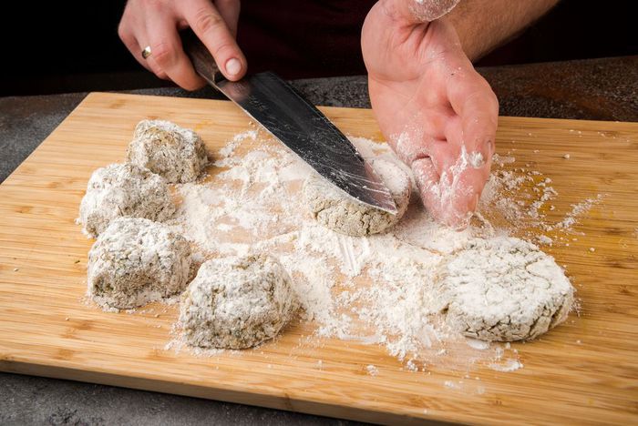 Мокрыми руками сформировать котлетки и обвалять их в муке.