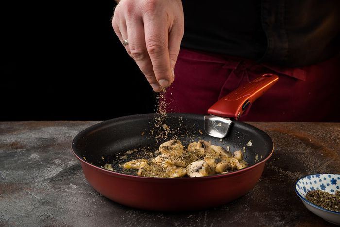 Разогреть в сковороде сливочное масло и 1 ст. ложку оливкового масла и обжарить лук с грибами до золотистого цвета, посыпать орегано, посолить, поперчить.