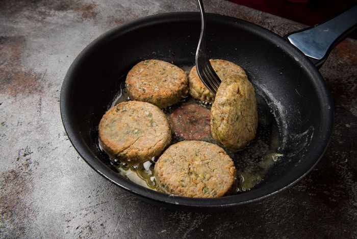 Разогреть в сковороде оставшееся оливковое масло и обжаривать котлетки с каждой стороны по 1 минуте. Затем накрыть крышкой и жарить до готовности.