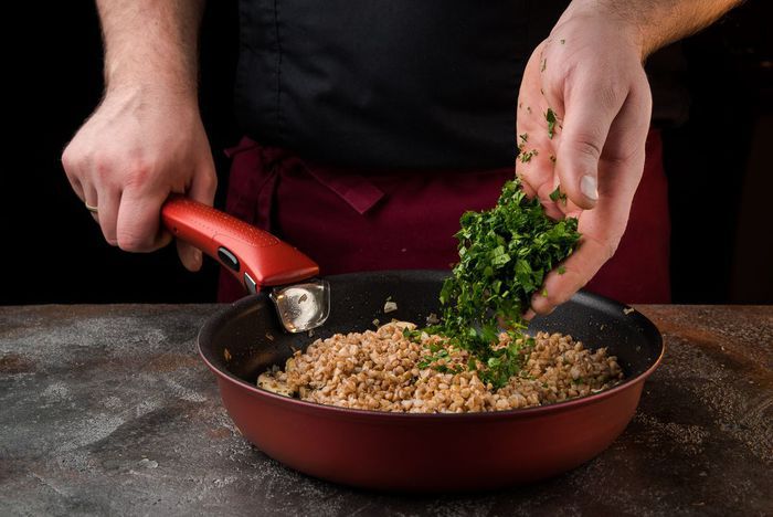 Выложить готовую гречку к грибам с луком (немного гречки оставить), обжарить все вместе. Петрушку мелко порубить.
