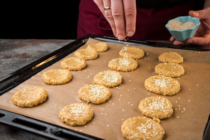 Через час охлажденное тесто делим на порционное печенье, выкладываем его на противень с пергаментом, придавая форму. Можно посыпать печенье кунжутом или кокосовой стружкой по желанию.