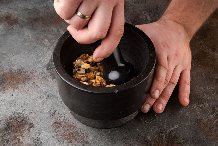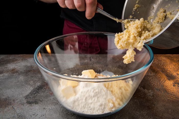Сахар, муку, измельченные орехи и овсяные хлопья выложить в одну миску, добавить сливочное масло и все тщательное перемешать.