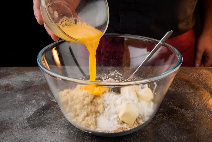 Яйцо немного взбить венчиком и также добавить в тесто.