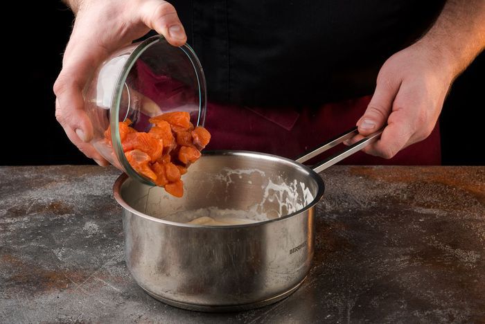 Семгу нарезаем кубиками, перекладываем в сотейник. Заливаем сливками с молоком и тушим 10 мин.