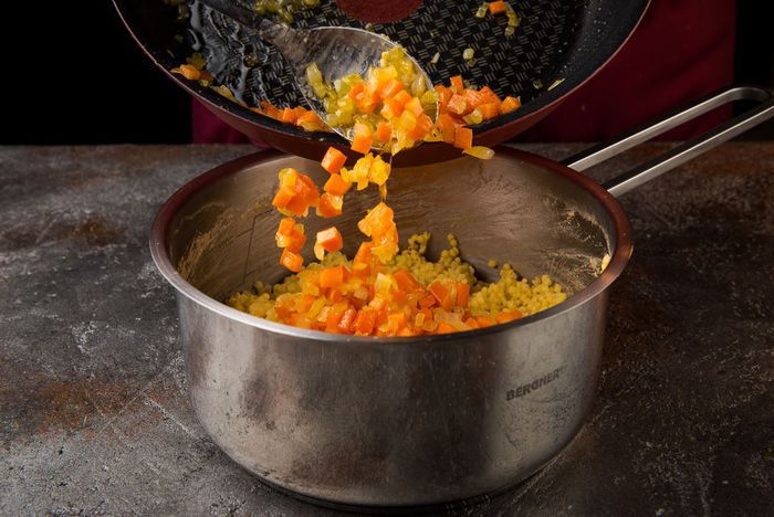 Лук очистить и мелко нарезать, морковь нарезать кубиками и обжарить на оливковом масле, добавить к готовому пшену.