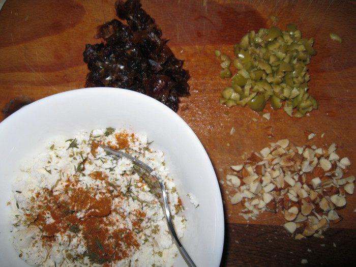 Это почти все, что нам нужно, кроме меда. Финики, миндаль и оливки порубить, но не мелко. Фету размять вилкой, добавить орегано, тимьян и перец чили (его количество зависит от ваших вкусовых предпочтений, но добавьте хоть немного, без него никак), мед. Все тщательно вымесить. Добавить в фету рубленые продукты. Тоже хорошо смешать. По желанию сформировать шарики. Надеюсь, вам придется по душе!