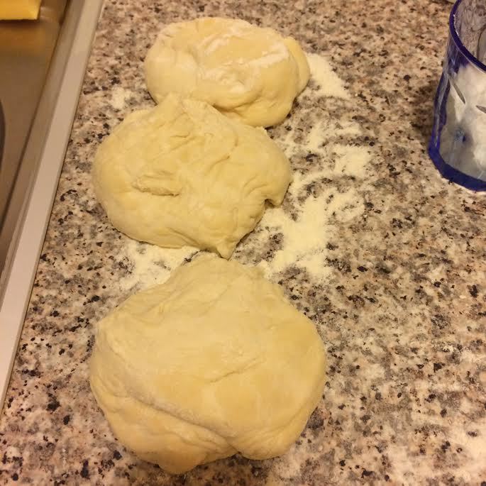 Тесто разделить на 3 части. Сковороду слегка смазать маслом и хорошо нагреть.