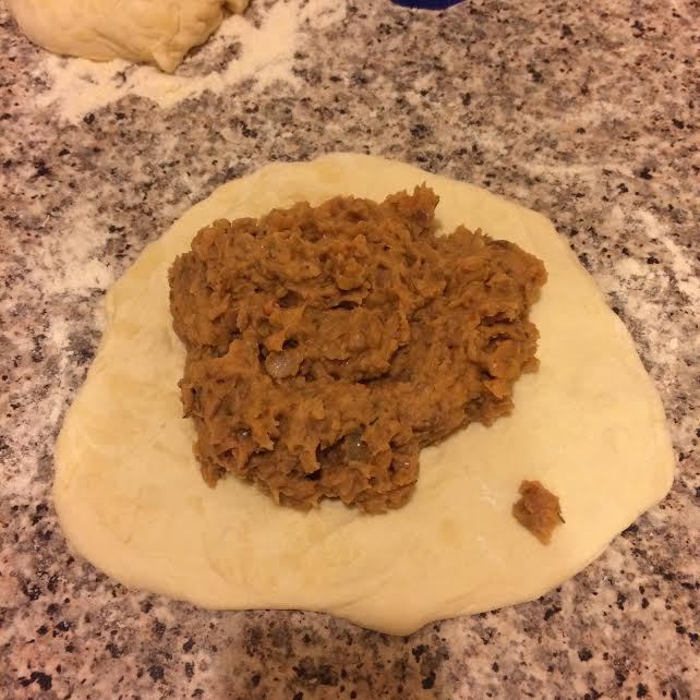 Тесто слегка раскатать (я это делаю руками), выложить начинку.