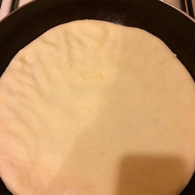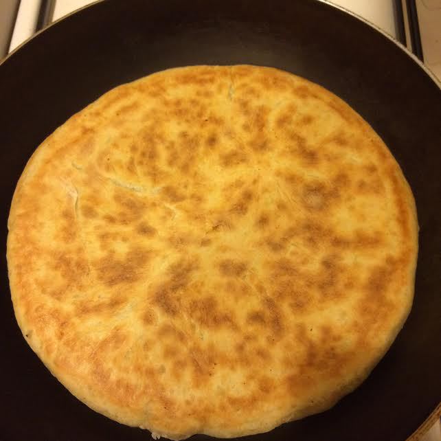 Аккуратно перенести лепешку на сковороду, положить швом вниз и руками распределить по сковороде.