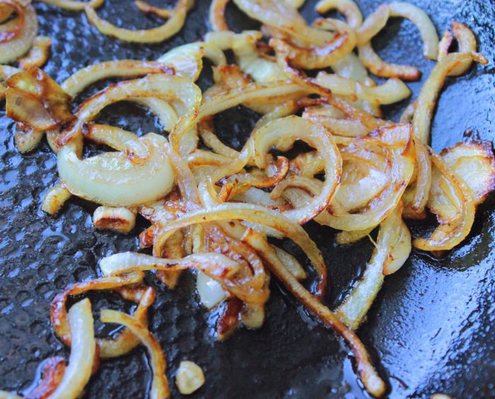 Разогреть на сковородке растительное и сливочное масло в равных пропорциях. Лук порезать полукольцами, затем разобрать руками на полоски. Выложить лук на сковородку.