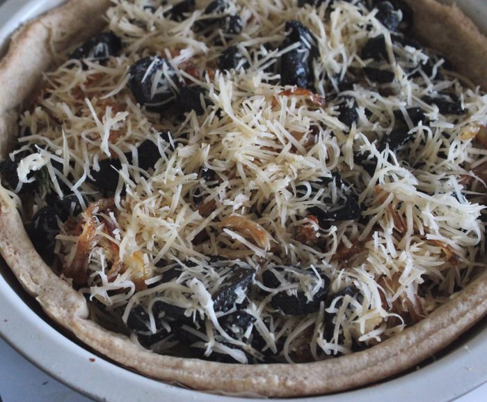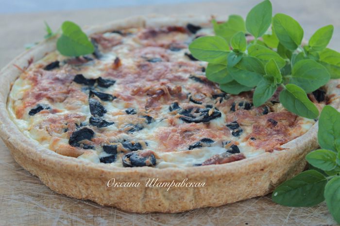 Остывшие грибы смешать с луком и сыром, выложить все это на готовую основу. Вылить сливочно-яичную заливку поверх начинки. Поставить киш в духовку и выпекать при 175°С 35 — 40 минут до готовности и золотистого верха.