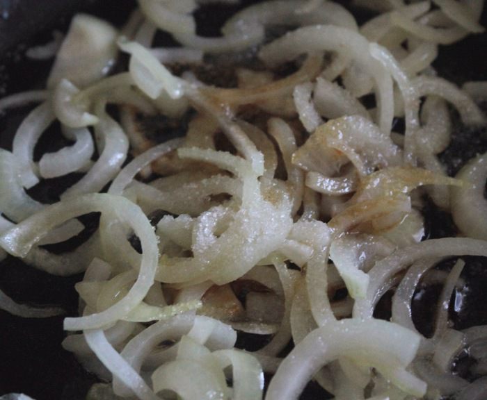 Когда лук обмякнет и станет прозрачным, добавить сахар и бальзамический уксус, довести лук до карамелизации.