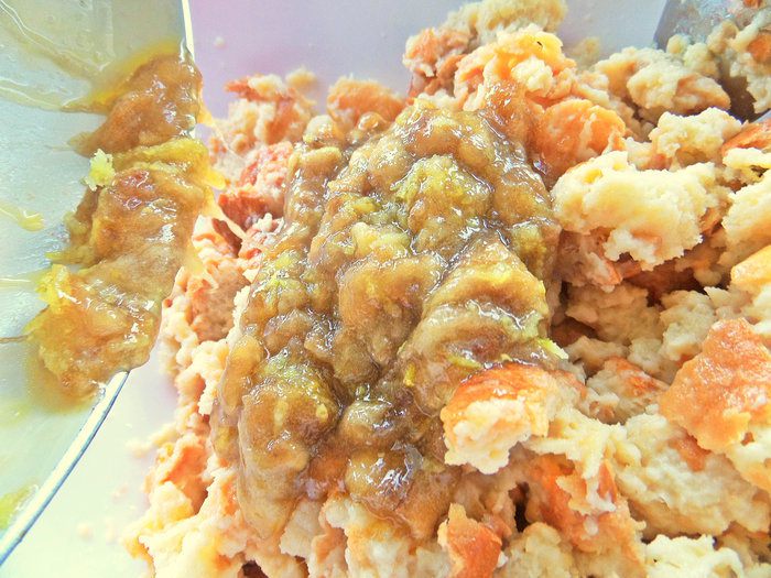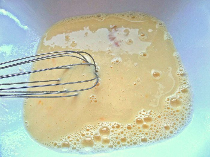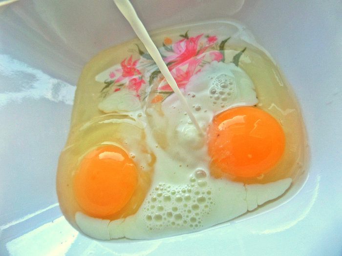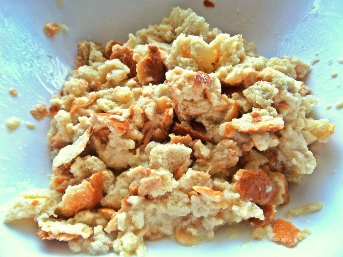 Сухую булку поломать и залить смесью. Дать пропитаться несколько минут.
