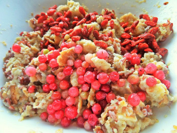 Всыпать любые ягоды, можно замороженные. Вместо годжи — изюм.