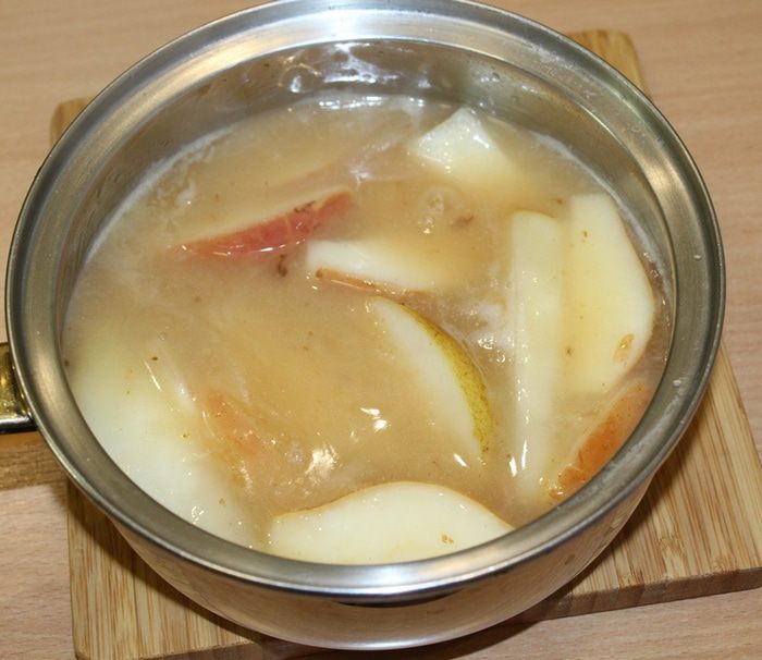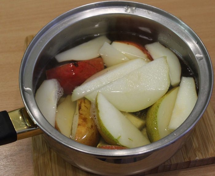 В кастрюльку налить сок, вино, добавить сахар, добавить нарезанные груши, припустить их в сиропе.