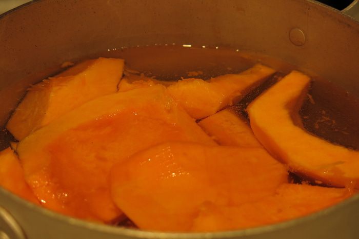 Ставим варить тыкву, 15 минут после закипания. Лен кладем в 750 мл холодной воды, даем закипеть и варим 30 минут на среднем огне, периодически помешивая (в исходном рецепте предлагалось уваривать лен 1 час, но за такое время вся жидкость выкипает), после уваривания должна остаться треть воды, а семена дать слизь.