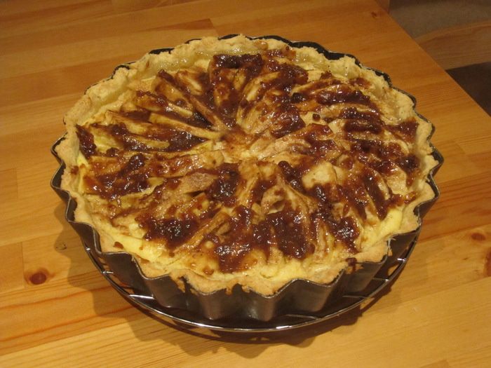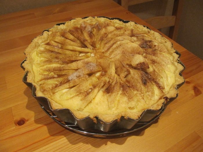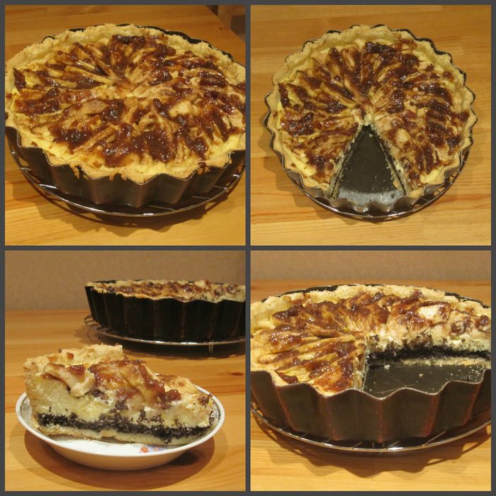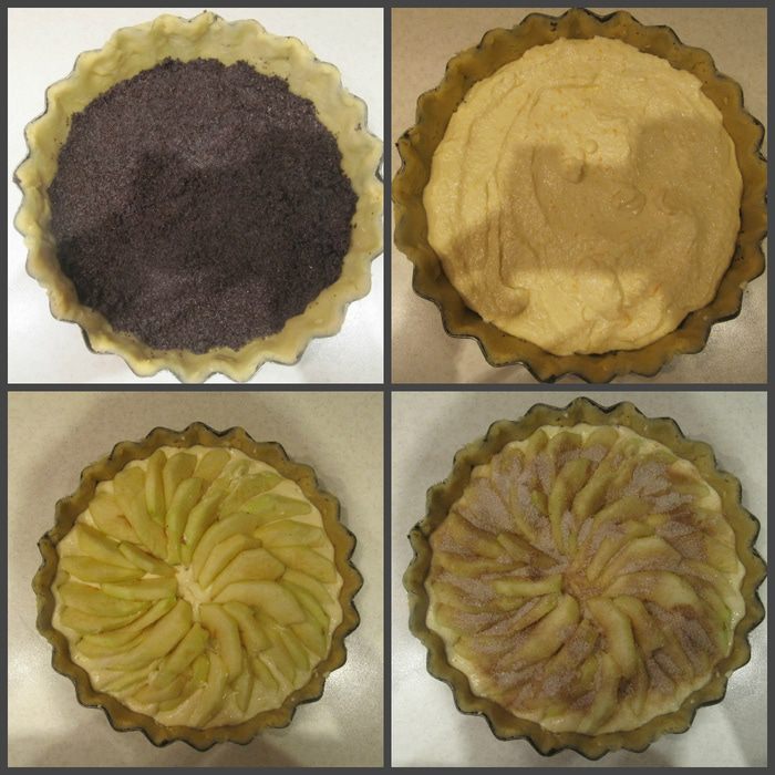 На охлажденную песочную основу выкладываем слой мака, хорошо утрамбовываем, затем выкладываем слой творожной начинки и разравниваем. На творожную начинку выкладываем ломтики яблок веером. Посыпаем их сверху сахаром, смешанным с корицей, и отправляем тарт в духовку, предварительно разогретую до 180°С, на 40 минут.