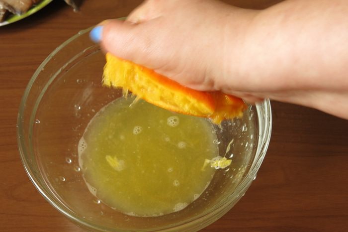 Выжимаем сок кисловатого апельсина, как вариант апельсин-лимон.