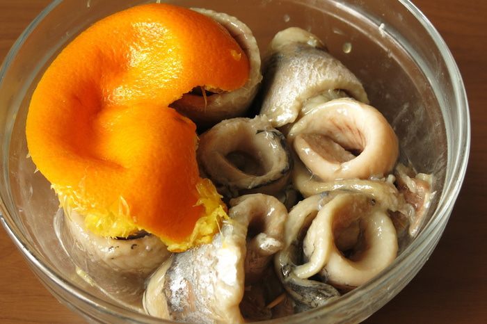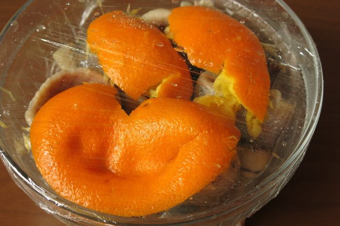 Выкладываем в посуду с остатками маринада, накрываем шкуркой апельсина.