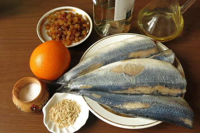 Подготовим рис, апельсин, масло рисовое Biolio, изюм, соль, рыбу (у меня сельдь, вес без голов не потрошеной 460 г — 4 шт.), можно взять любую морскую.