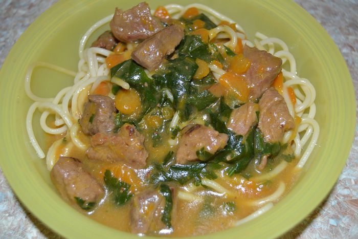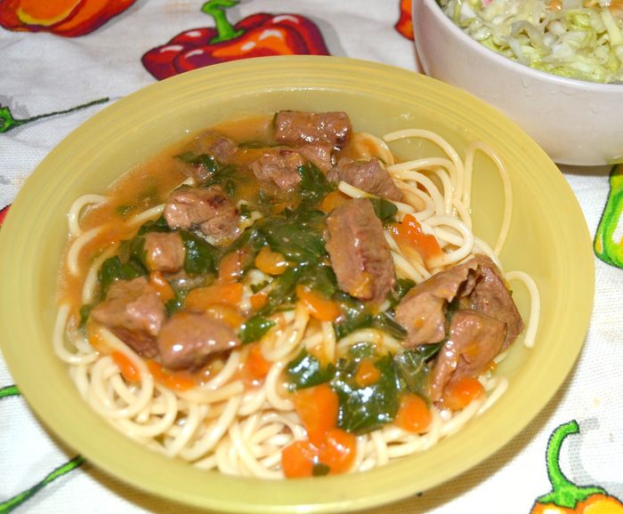 Гарниром у нас были макароны. Но, думаю, с гуляшом хорошо сочетаются и рис, и картошка, в общем, на ваш вкус.