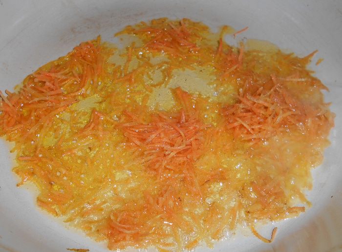 Одну морковь трем на мелкой терке и обжариваем на растительном масле до мягкости.