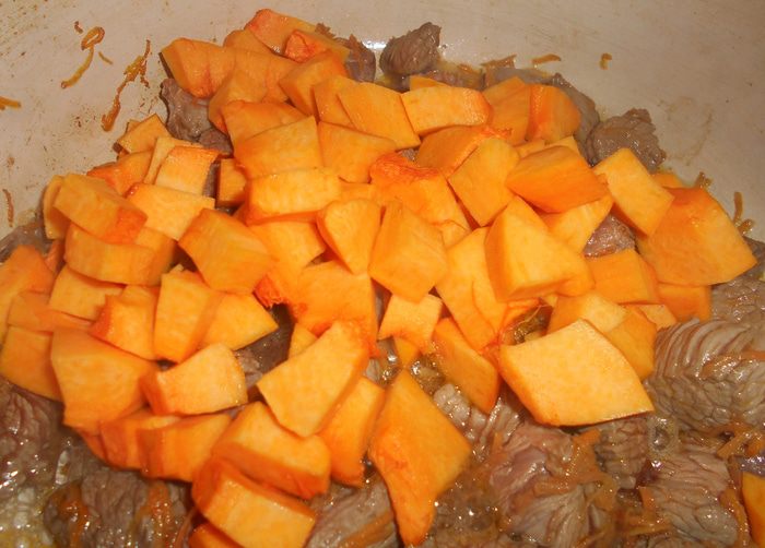 Добавляем к мясу тыкву, очищенную от кожицы и семян и нарезанную кубиками. Перемешиваем, притушиваем минут 5.