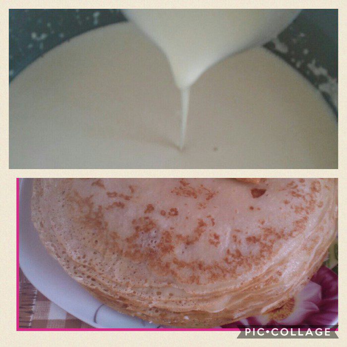 Тем временем займемся блинным тестом: отдельно смешаем сухое, отдельно жидкое. Соединим все ингредиенты. Все, можно жарить на раскаленной сковороде.
