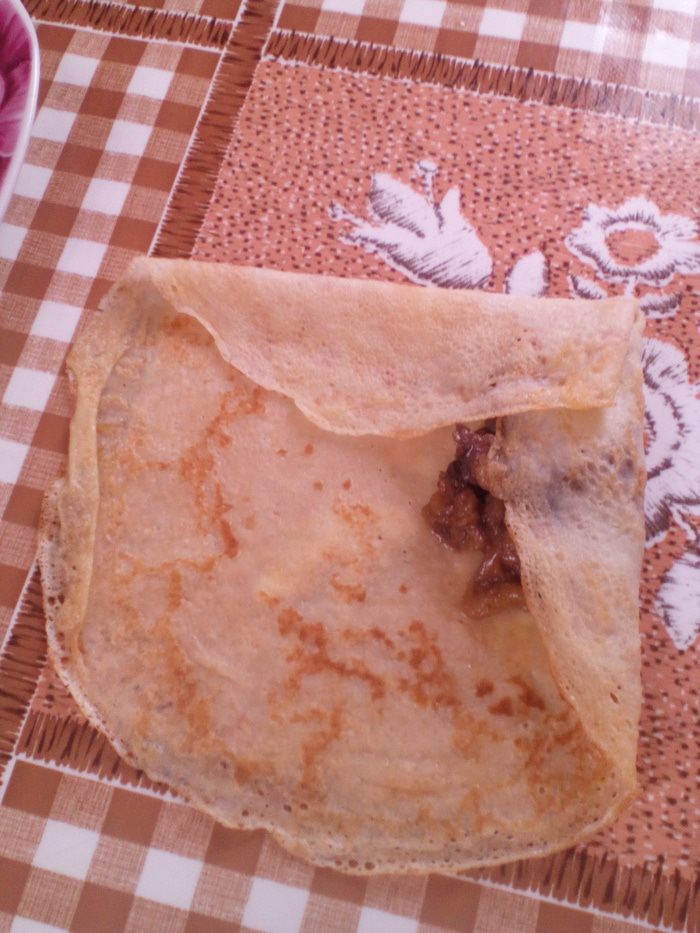 Блинчик начинить начинкой (у меня 1 ст. л.) и завернуть рулетиком.