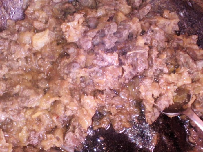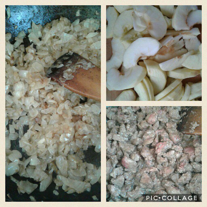 Для начала подготовим начинку. Я нарезала мелко печень, кубиками лук, яблоки — дольками. Отдельно обжарила печень и лук, затем соединила и добавила нарезанные яблоки. Посолить, поперчить, добавить муск. орех и вино. Тушить до готовности.