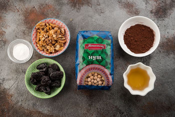 Нут ТМ «Националь» отварить до мягкого состояния. Чернослив промыть и замочить в теплой воде на 10 минут. Орехи измельчить.
