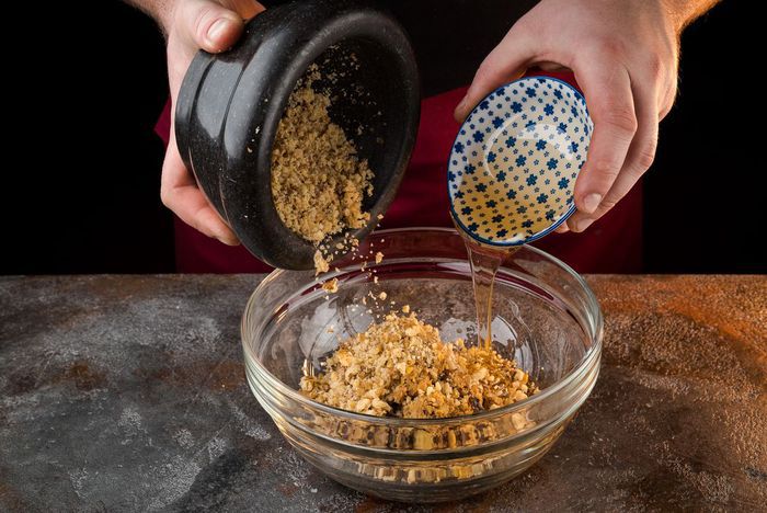 Все перемешать, добавить мед и орехи.
