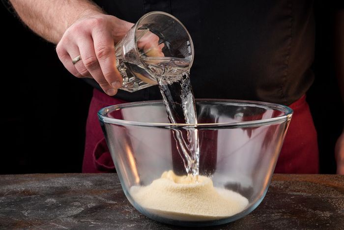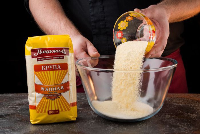 Влить стакан воды, перемешать и дать манке набухнуть, примерно час.