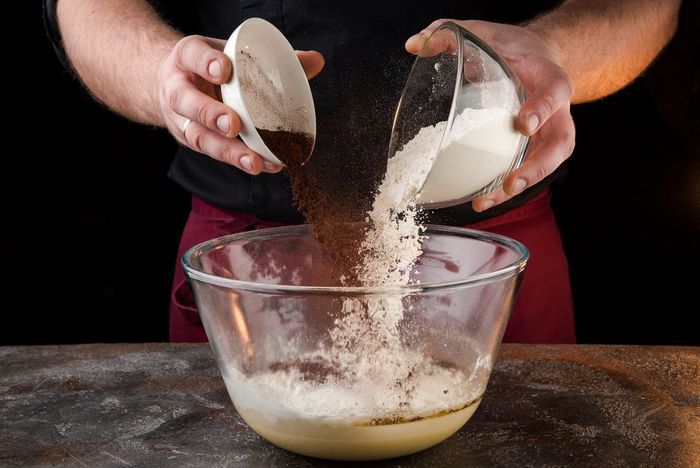 Влить растительное масло и перемешать. Всыпать какао, муку и разрыхлитель. Перемешать (тесто, как густая сметана).