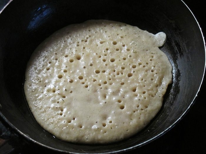 Выпекаем тонкие блинчики. Видно, какие они тонкие и пористые.