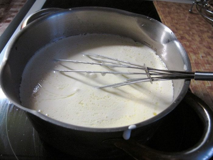 Просеиваем муку, слегка подогреваем молоко «Домик в деревне» примерно до 45 — 50°С.