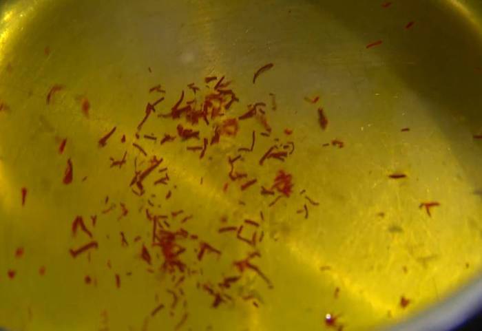 Шафран выложить в оставшийся бульон и слегка прогреть его.